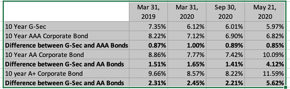 The heightened risk aversion can be seen in interest rates lower than the 10-Year Govt Security for the AAA rated companies.