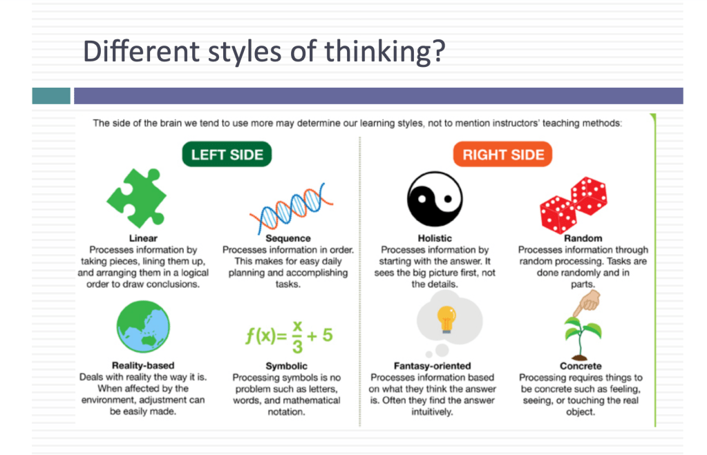 The Right side is characterized as big picture, intuitive, processing information on touch & feel rather than looking at letters, words or numbers.